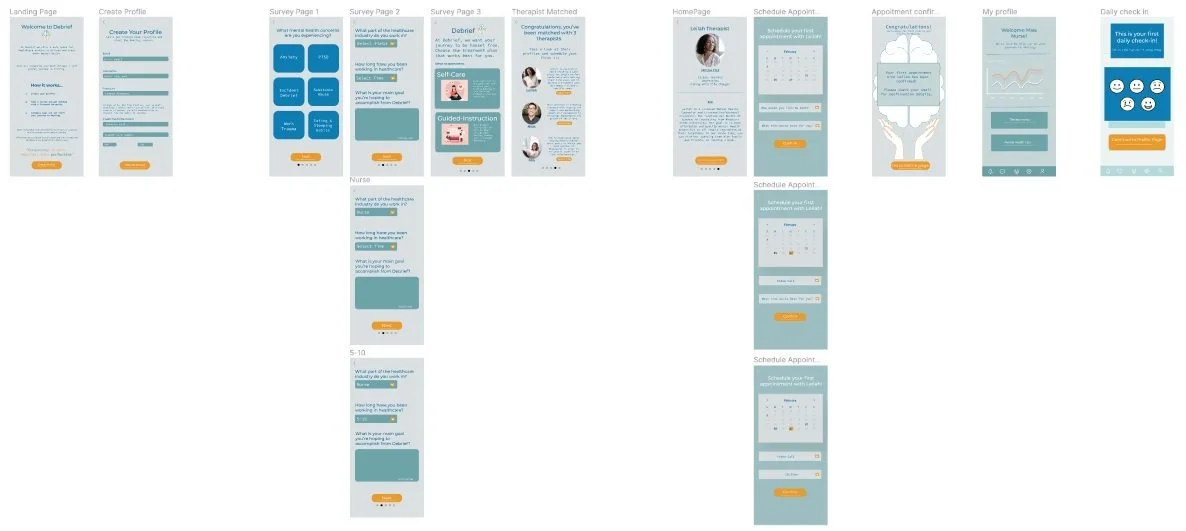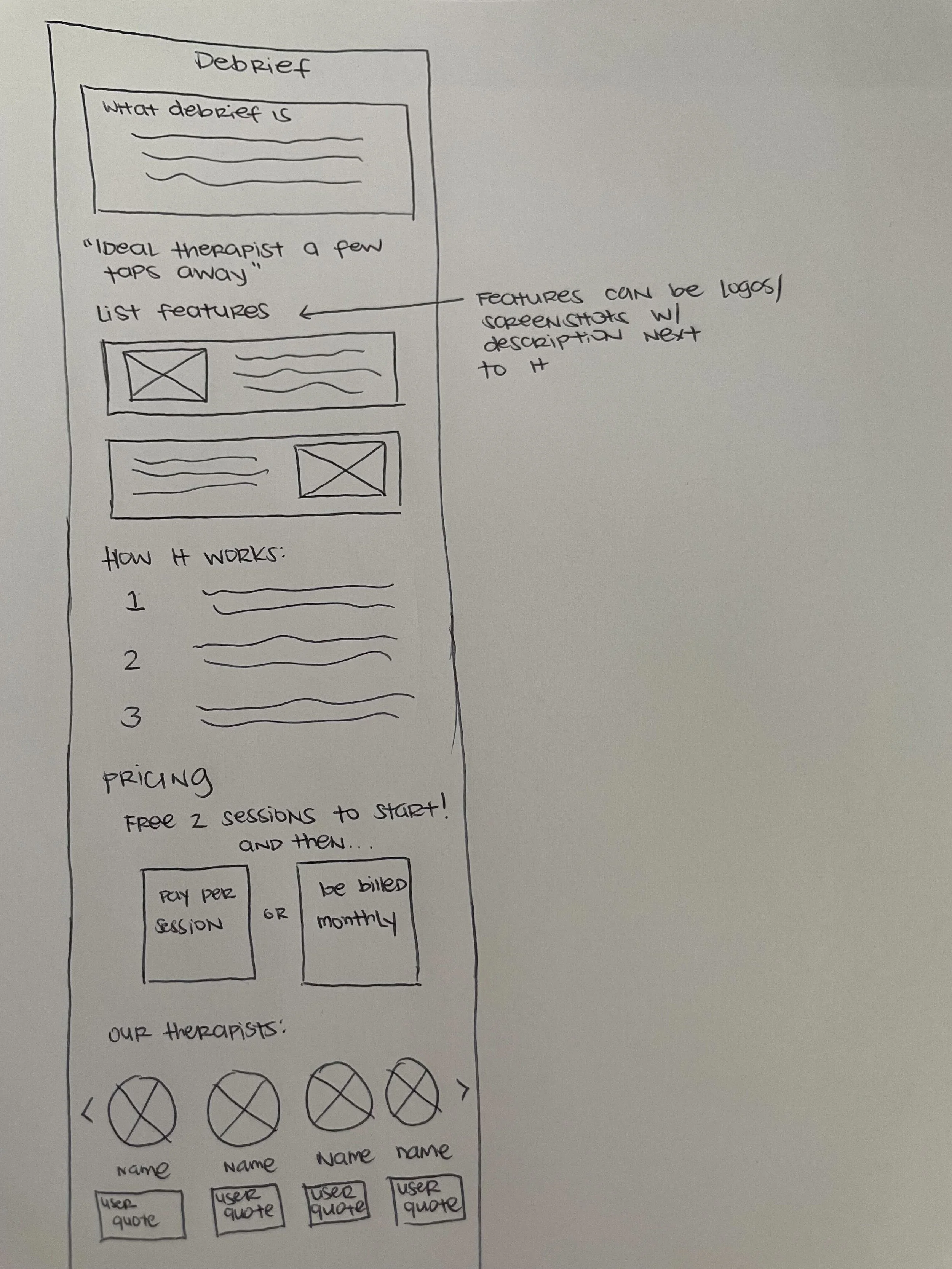 Home page- We wanted clear and concise copy stating the purpose of Debrief and a Call to action button leading the user to the mental health survey.