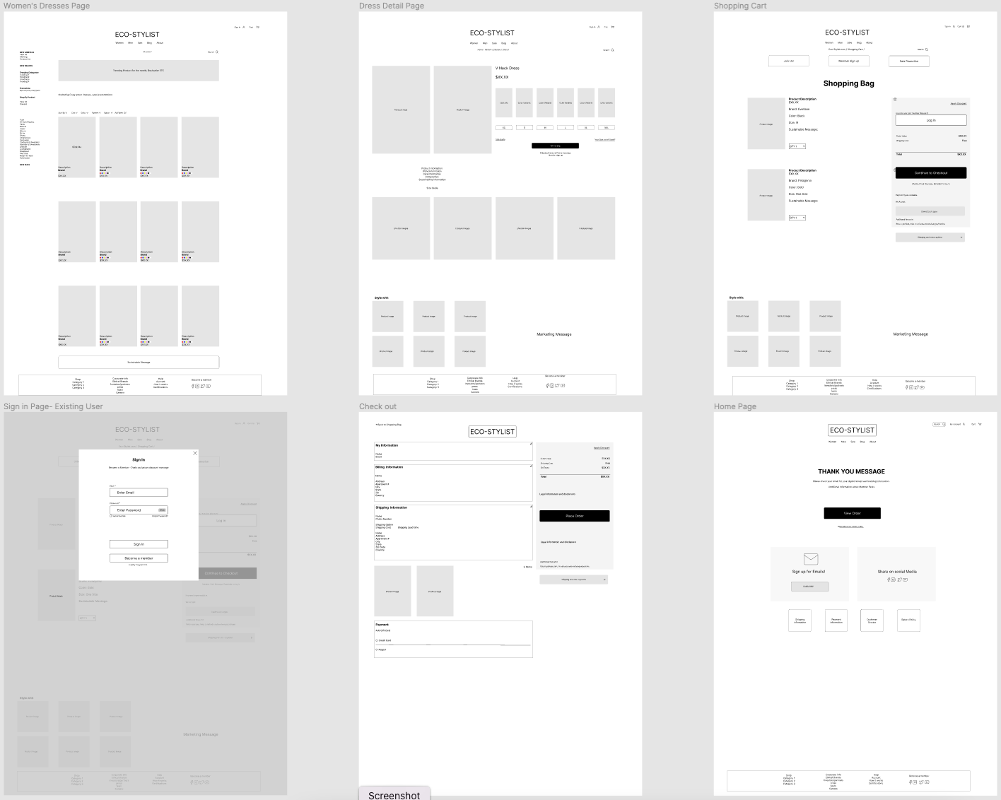With the four main pages created, it is time to create the subset of pages that would complete an e-commerce process. While creating the blocks of each page it is important to keep in mind how the user will use each page, and not just the aesthetic layout of each page. We need to add affordances such as back buttons, sliders and tabs that are recognizable for users to interact with the website.